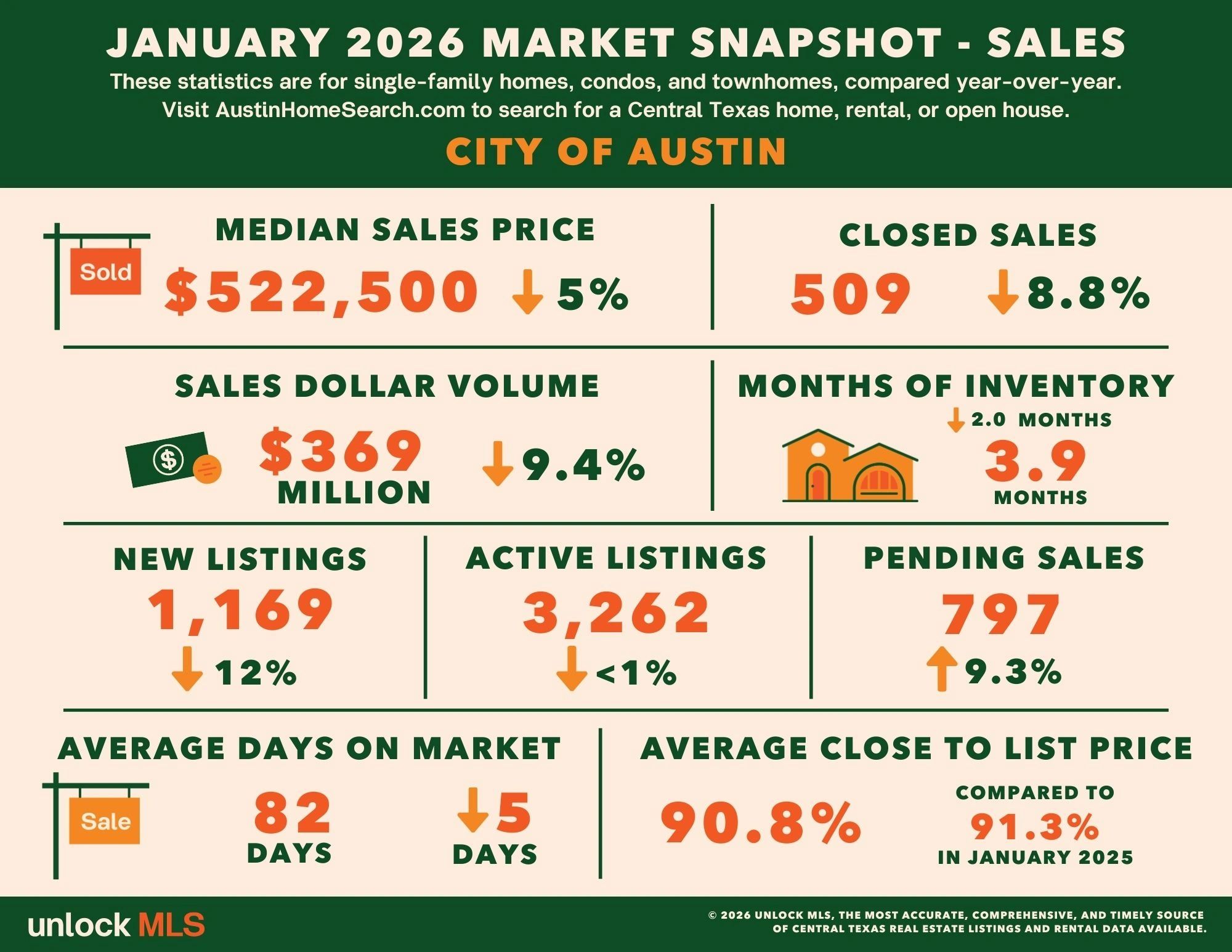AUSTIN, Texas, February 11, 2026— According to the January Central Texas Housing Report released by Unlock MLS, pending sales increased to 2,349 transactions, up 10.1% year over year and up more than 23% from December, signaling strengthening buyer demand as Central Texas approaches the spring homebuying season. At the same time, months of inventory declined by nearly one month compared to last year, an indication that growing demand is absorbing new supply as it enters the market. Active listings remained relatively steady at 10,083 properties while the median home price held at $400,495, down 2.3% from January 2025. Together, the data points to a market environment where buyer demand is keeping pace with new listing activity.